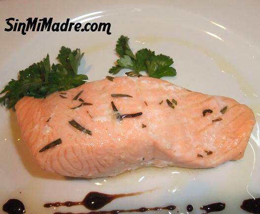 - Poner un chorrito de aceite en el fondo de un recipiente de microondas. Colocar encima el lomo de salmón previamente salado. Echar por encima un poco de pimienta blanca, el eneldo, el zumo de limon y otro chorrito de aceite.