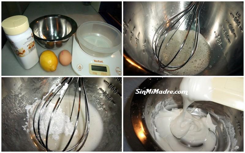 Pon en un bol la clara y se bate un poco con unas varillas hasta que comience a espumar. Incorporar una cucharada de azúcar y batir hasta que este bien incorporada, y repetir la operación hasta que hayamos incorporado todo el azúcar y tengamos una mezcla homogénea bastante blanda y blanca. En ese momento añade el zumo de limón y bate con fuerza.