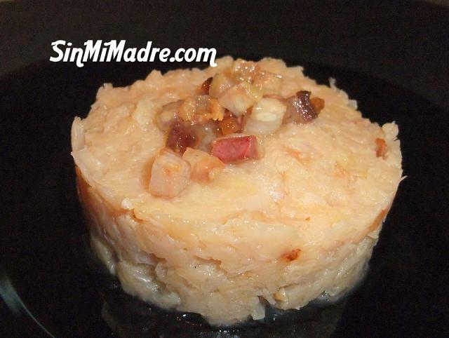 Echa la col y la patata cocidas en la sartén, aplastalas bien con ayuda de la espumadera (debe quedar casi como una pasta) y deja que coja un poco de color. Incorpora los ajos, la panceta y el bacón (excepto unos trozos) y revuelve para que se mezclen.